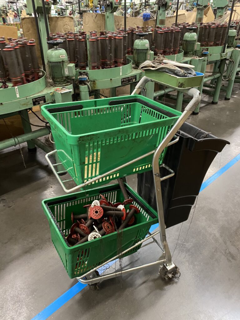 La forme de ce chariot a été déterminée par les utilisateurs pour minimiser les mouvements en manipulant ces bobines.