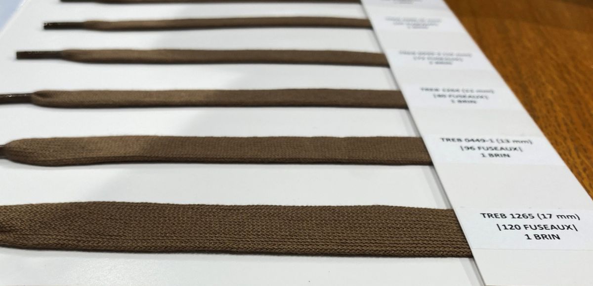 En plus du nombre de fuseaux, nous jouons sur le nombre de bouts de coton. Ainsi, nous proposons des versions à un bout ou à deux bouts de coton fin d’Égypte. Par conséquent, si nous doublons les fils sur un même métier, nous augmentons significativement la largeur du produit. Finalement, nous fabriquons des cordons allant de quelques millimètres jusqu’à environ 3 centimètres de large.